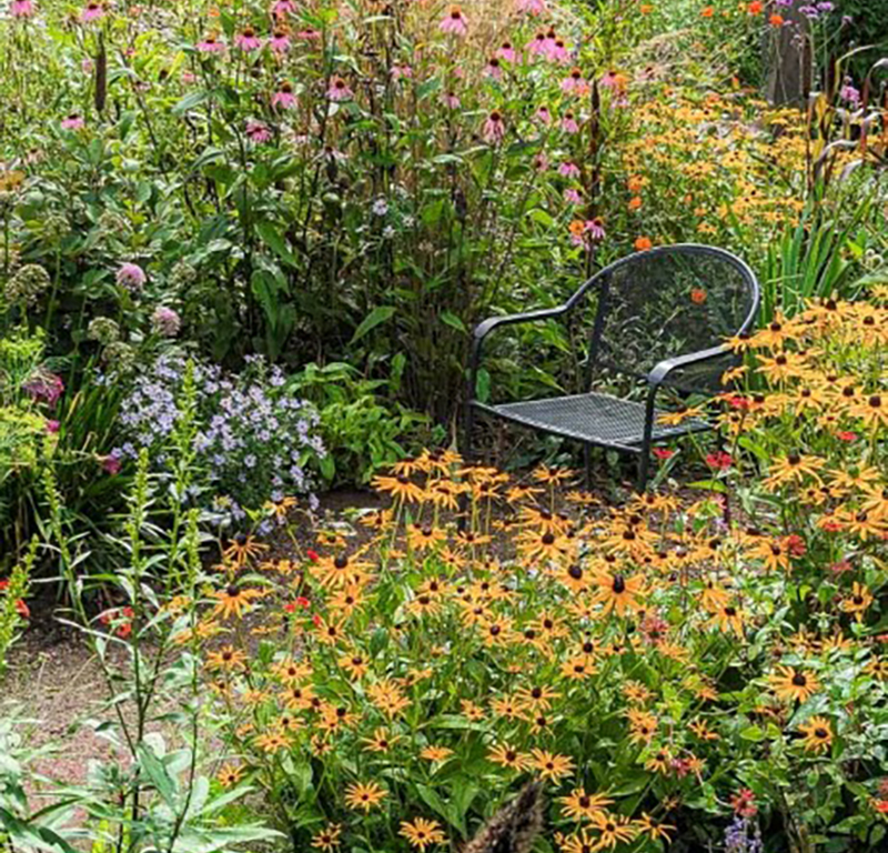 Lush, intensively planted ¼-acre garden of both common and rare perennials, annuals, shrubs, and other plants, chosen for their beauty and such contributions as food production, animal shelter, and bloom period.