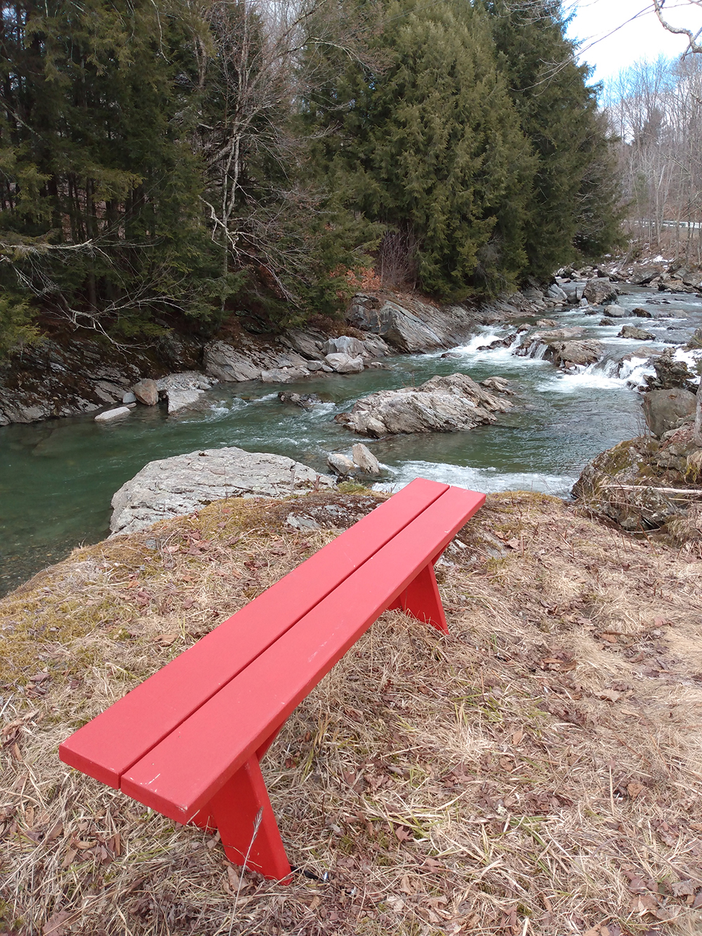 The Foundation added a red wooden bench to the edge of the overlook—and it’s more than a place to sit and savor the view. It’s also a pretty focal point, a dash of bright color in an otherwise green landscape, and a decoration that—like a piece of sculpture—marks the site as a special place: not an ordinary roadside but a naturalistic park with extraordinary features; one at which you should pause—or at least slow down—to enjoy.