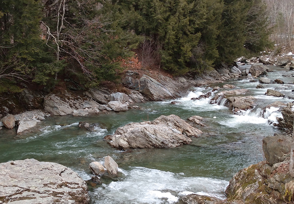 The Hazen’s Notch Road now offers a tenth of a mile of continuous views of the cascading river, its picturesque ledges, and the fringe of evergreens on its opposite bank.